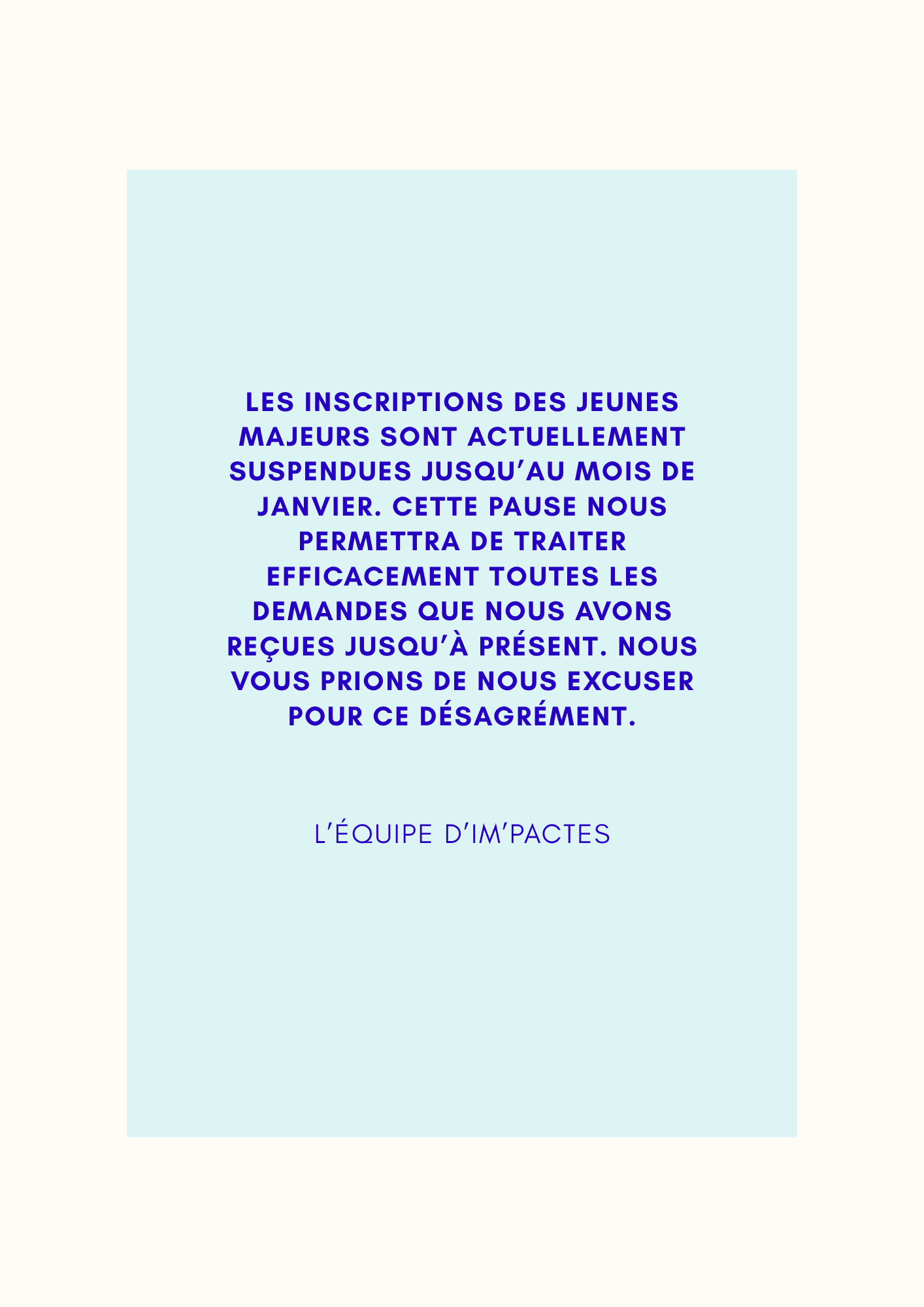 Nous savons que l’entrée vers le monde professionnel est compliquée et que l’on peut vite perdre ses repères. C’est pourquoi IM’PACTES propose de te soutenir jusqu’à tes 25 ans en te trouvant un mentor qui t’accompagne dans la création de ton projet professionnel, ou bien grâce à ses relations avec les entreprises pour t’aider à trouver un stage ou un premier emploi.